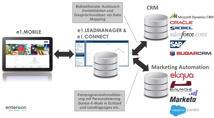 Die entergon Lösung e1.MOBILE verfügt über produktiv in Kundenprojekten genutzten Schnittstellen (und deren Customizing) zu CRM-Lösungen wie - in alphabetischer Ordnung - aurea update, MS Dynamics, Oracle Siebel, SAP C4C, salesforce.com und Sugar CRM. Auch E-Mail Marketing und Marketing Automation Lösungen wie eloqua, Evalanche oder Marketo wurden bereich mehrfach erfolgreich angebunden.